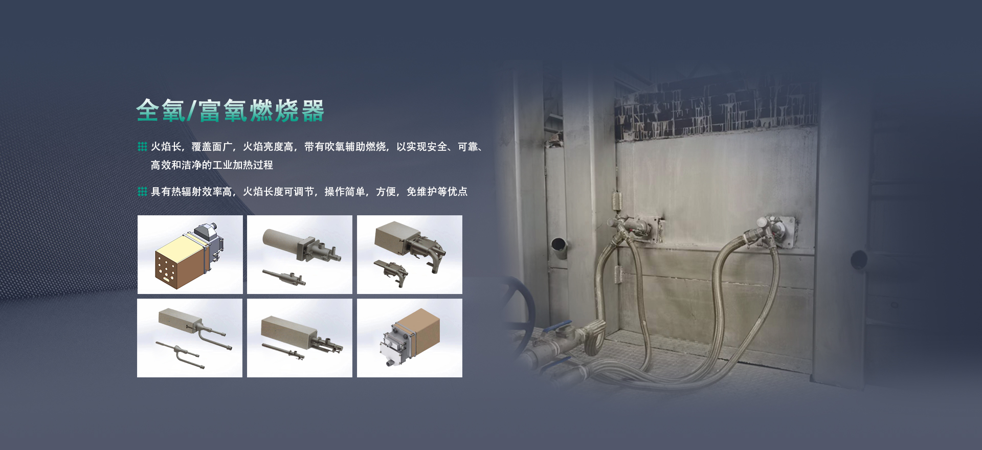 提供方案:成套熱能解決方案。高溫領(lǐng)域,采用全氧或富氧燃燒系統(tǒng),包含全氧燃燒器、燃?xì)?氧氣管路系統(tǒng)以及自動化控制系統(tǒng)